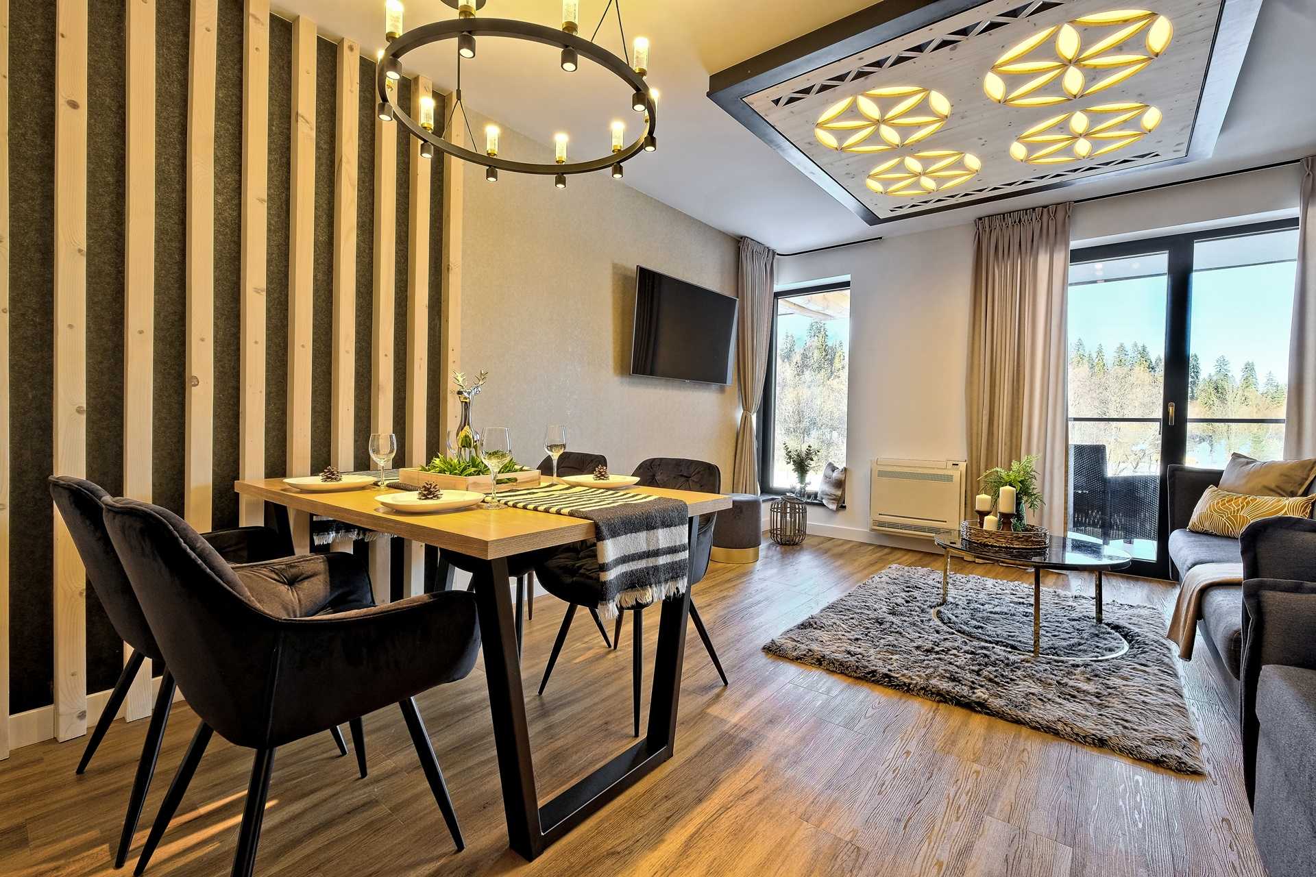 Główne atuty mieszkania, to przede wszystkim wysoki standard przy wykorzystaniu naturalnego drewna i kamienia, oraz funkcjonalność dzięki licznym przeszkleniom oferującym naturalne światło i kontakt z naturą.