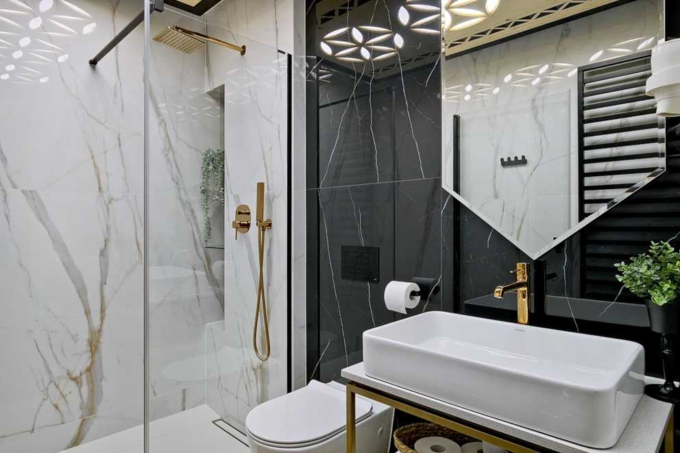 Łazienka: prysznic, toaleta, umywalka, szafka, lustro, grzejnik łazienkowy, suszarka, ręczniki.
