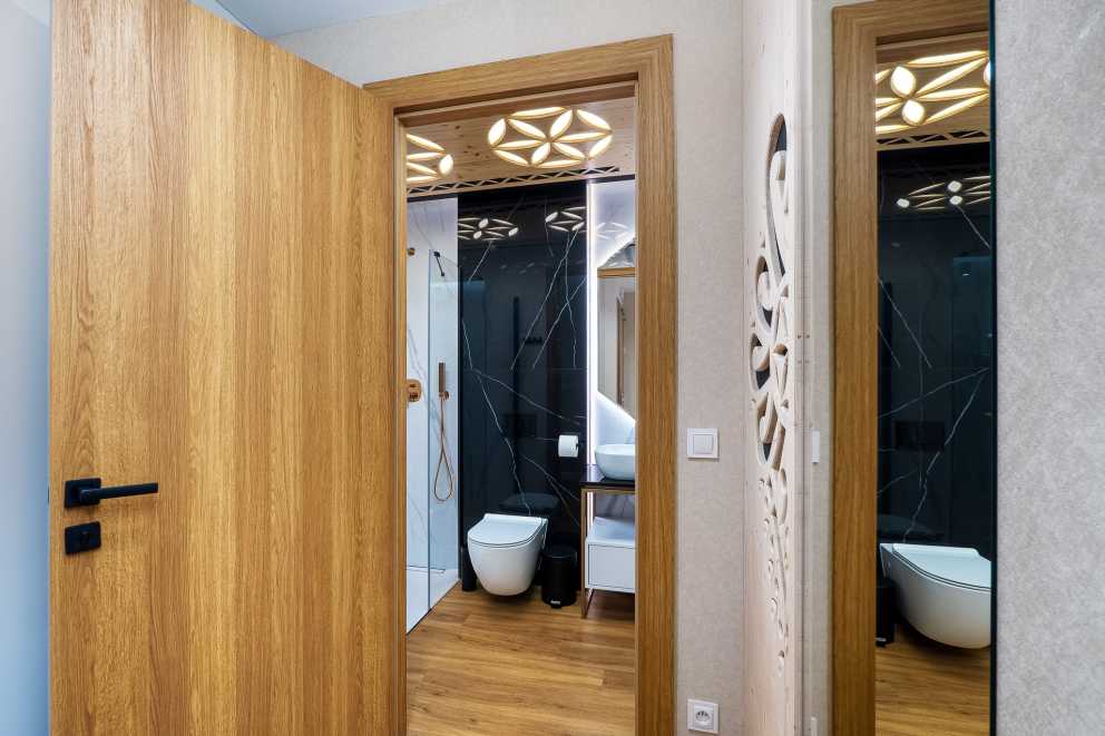 Główne atuty mieszkania, to przede wszystkim wysoki standard przy wykorzystaniu naturalnego drewna i kamienia, oraz funkcjonalność dzięki licznym przeszkleniom oferującym naturalne światło i kontakt z naturą.