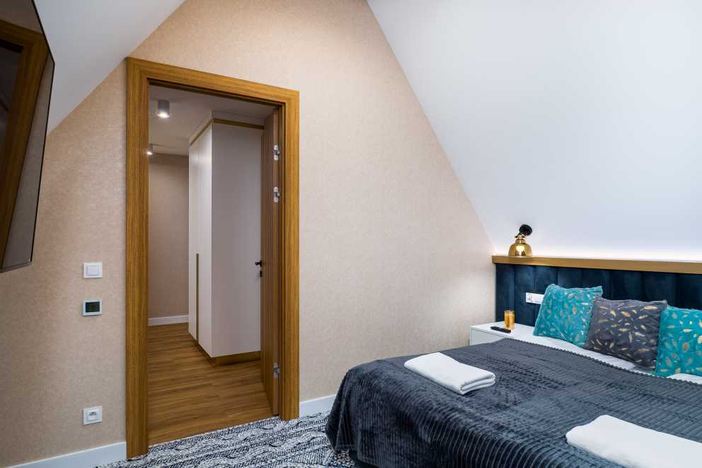 Sypialnia: łoże małżeńskie o rozmiarze 160x200, stoliki nocne, wyjście na drugi balkon z widokiem na okolicę, TV.
