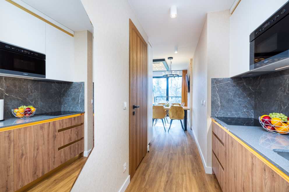 Aneks kuchenny: nowoczesna zabudowa kuchenna z lodówką, płytą indukcyjną, zmywarką, mikrofalówką, zlewozmywakiem i okapem. Wyposażony jest w czajnik, garnki i patelnie, zastawę stołową dla 4 osób.