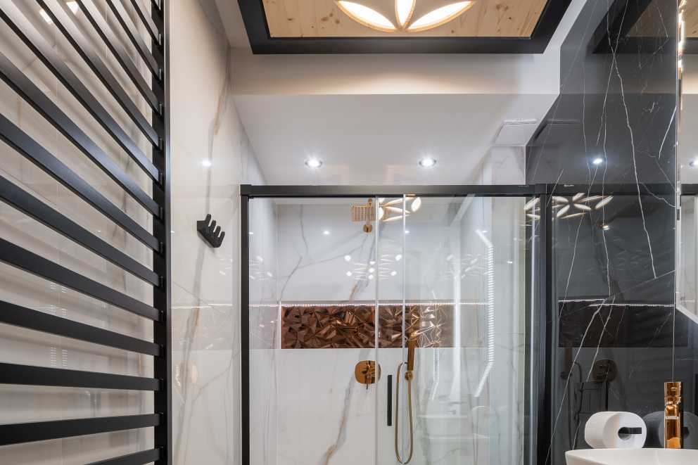 Łazienka: prysznic, toaleta, umywalka, szafka, lustro, grzejnik łazienkowy, suszarka, ręczniki.