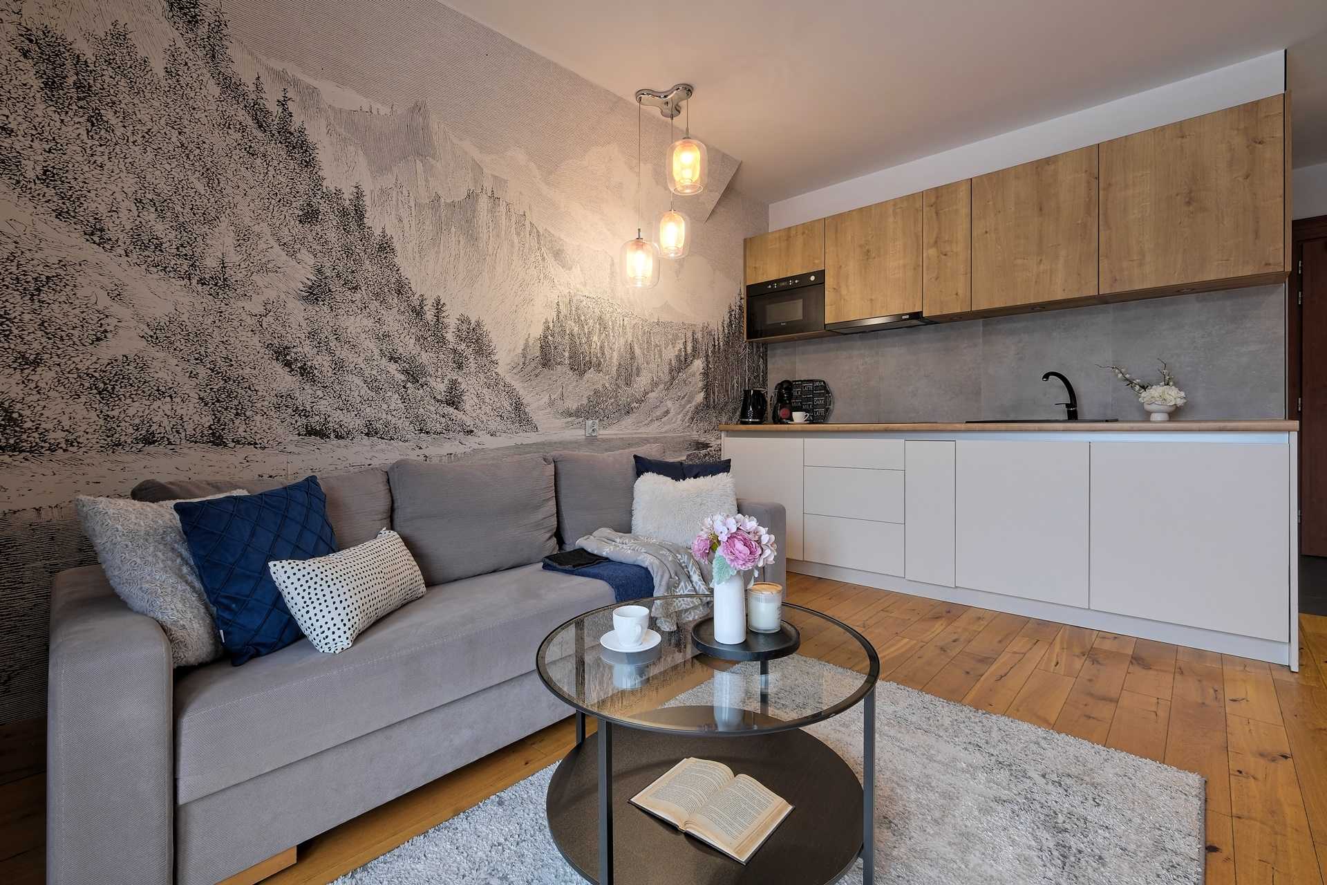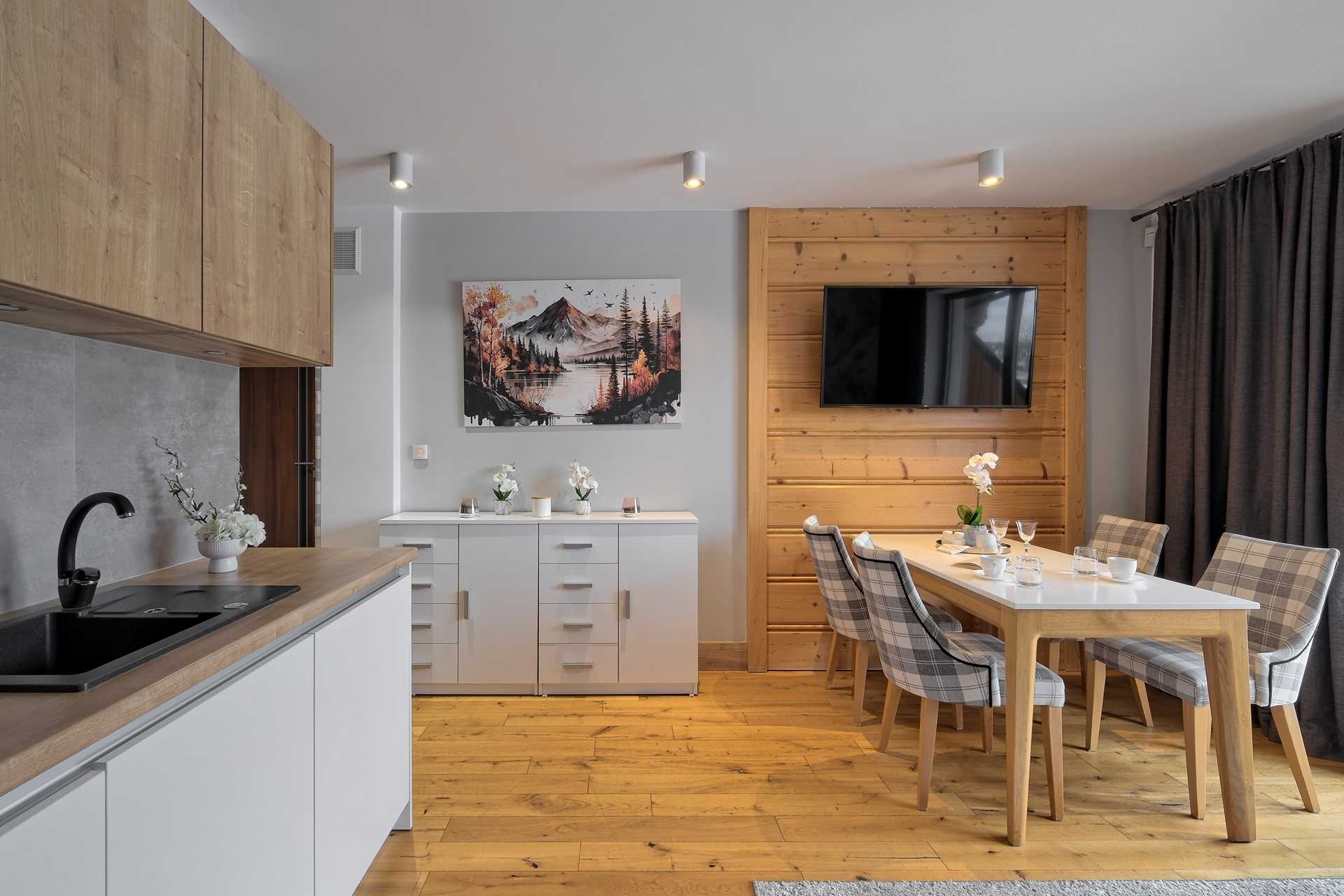 Aneks kuchenny: nowoczesna zabudowa kuchenna z lodówką, płytą indukcyjną, zmywarką, mikrofalówką, zlewozmywakiem i okapem. Wyposażony jest w czajnik, garnki i patelnie, pełną zastawę stołową.