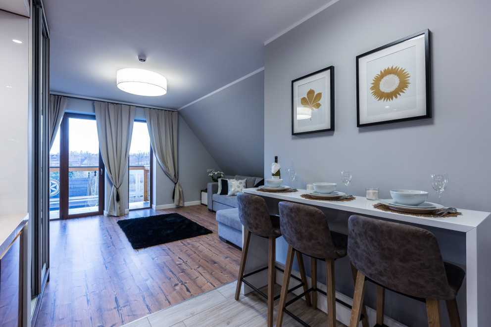 Salon: stół barowy oraz 3 krzesła, TV, rozkładana sofa dla 2 osób, szafa, wyjście na balkon.